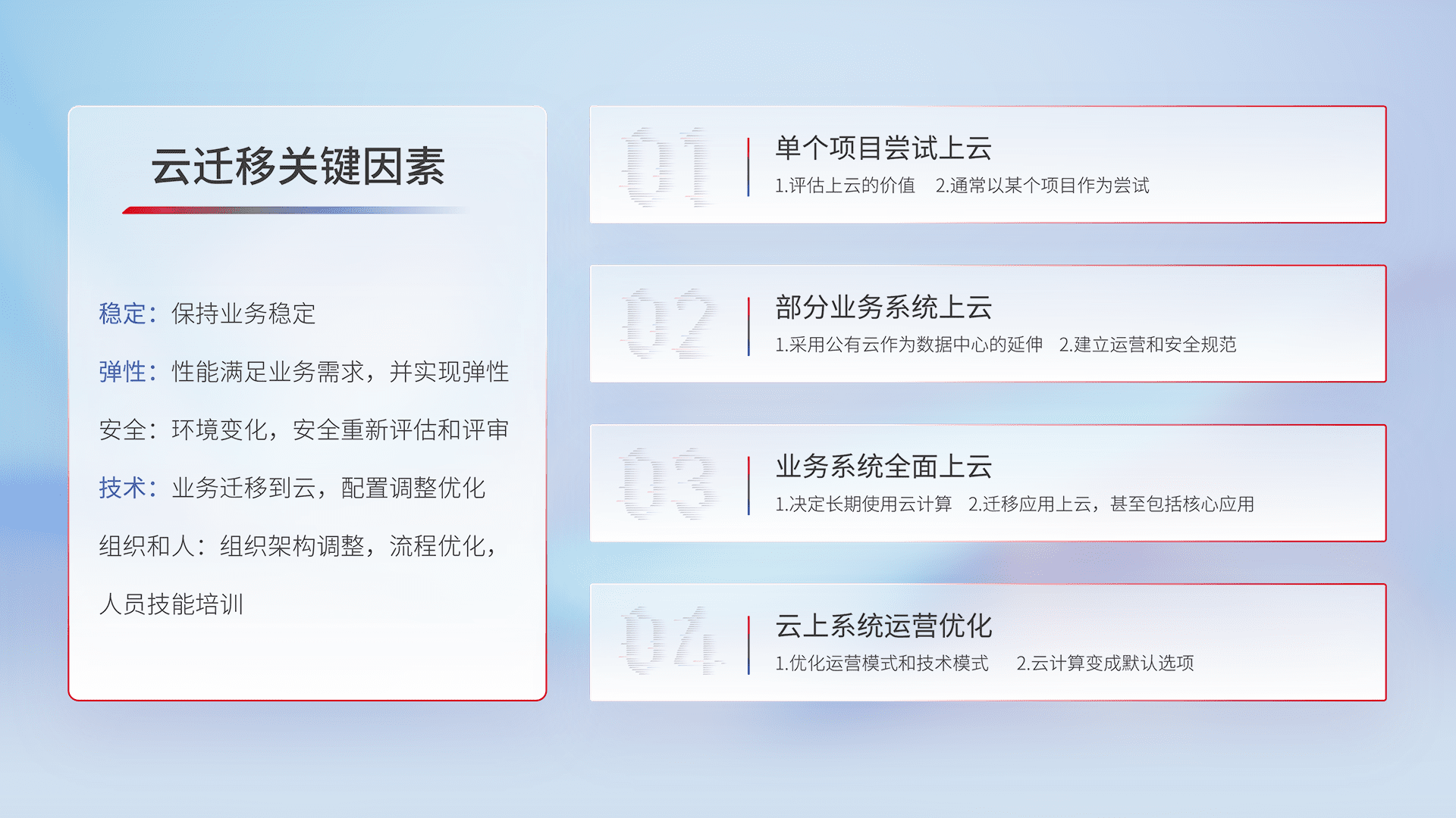 结合实际业务,,,从规划设计、、、云平台选型、、、、云原生改造、、数据迁移、、集成交付,,,迁移全过程为客户识别最佳上云路径,,,,做好风险识别管理,,,设计网络架构、、身份权限、、、安全审计合规、、操作审计、、、、日志审计、、、、监控告警策略、、、、多站点容灾设计等,,,对云上基础设施进行整体规划,,,,提升IT治理水平,,,,以满足弹性、、、、高可用、、、、高性能的需求。。