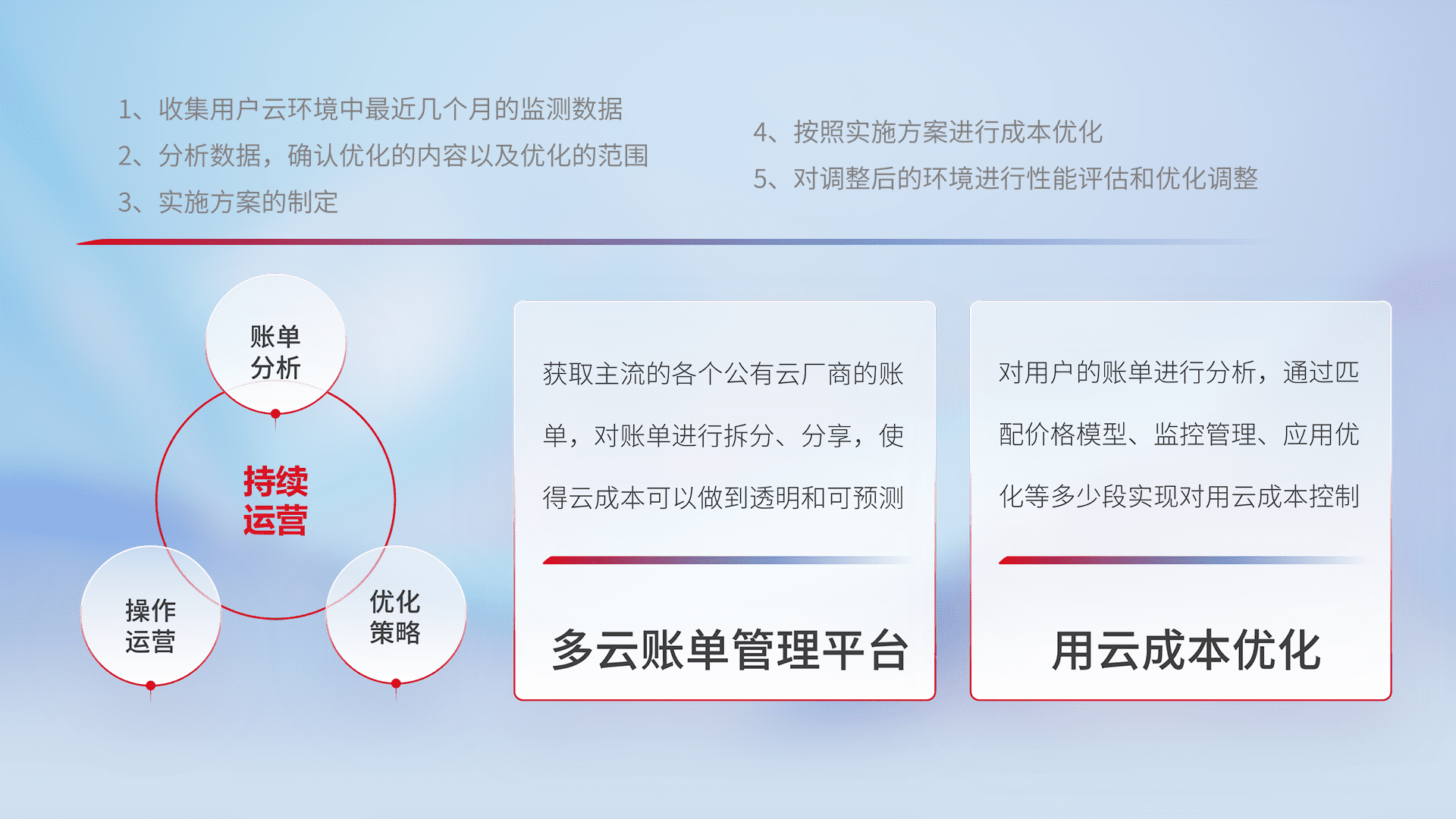 通过多云纳管,,以统一的资源数据模型把客户的云资源进行抽象和封装,,,,进而实现对多云资源的统一操作,,保障云资源管理的可靠性、、、、稳定性与可用性。。量身定制化运维内容,,配置、、、、开发运维、、补丁管理、、、备份、、监控、、、认证和访问管理、、、、审计和日常巡检等,,,,保障在用云过程中的可靠度,,,稳定度以及高可用率。。。。